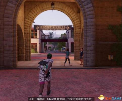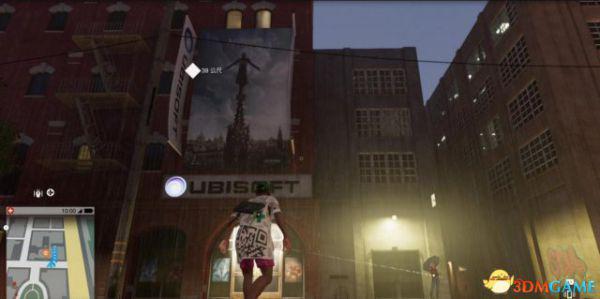 到达以后,可以看到很显眼的育碧公司LOGO以及刺客信条的海报,而我们的目标点就在育碧大楼的楼顶。