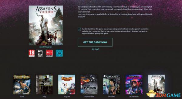 为了庆祝育碧公司成立30周年,育碧在2016年下半年开启了每月免费送游戏的活动,按照计划本月育碧将送出刺客信条3,目前该游戏已经可以免费领取。