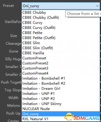 图中方框中几个按钮,outfit/body表示的是衣服/皮肤选项(B社偷懒,直接把游戏中衣服定义成皮肤一类),下拉菜单中有果体身形、游戏内原版衣服和衣服类mod添加进的选项,cbbe body直接表示果体;preset是身形文件,包括cbbe的默认身形、自己做的身形文件和mod添加的身形都在这里选择;preview是预览,在调整身形的时候需要用到,他的界面是这样的