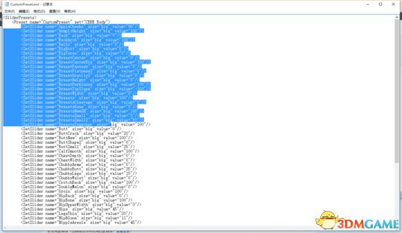 注意该文件的数据是从第四行开始(也有其他MOD得来的身形文件是第5/6/7行开始),将之前自己设定的身形数据黏贴替代后保存再打开bodyslide就可以使用自己设定的身形了。不过3.1版本的直接点击save preset就行了。