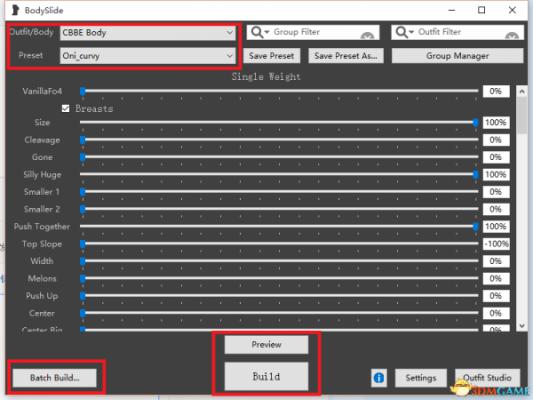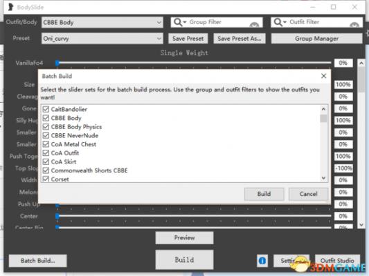 选择你要使用的的皮肤,然后点build,游戏内就是自己定义的身形了。注意,里面cbbe body是果体,cbbe nevenude是穿内衣的,如果使用的cbbe 1.1会有一个cbbe body physics,这个是物理摇乳,不过摇乳效果一般,而且只有果体有效,穿上衣服后喜闻乐见胸部变形,这3个皮肤只能应用一个,因为应用后产生的文件名都已一个,之前应用的会被替代,具体用哪个司机们自己看情况吧。
