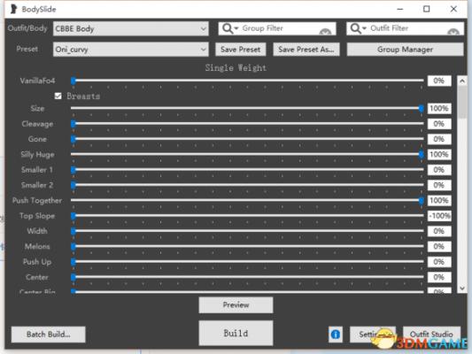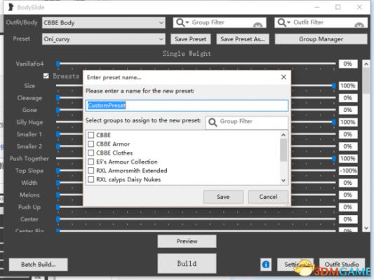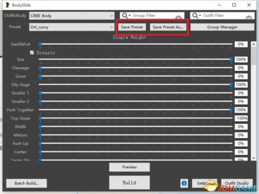 相信贴吧里的各位冰棍对bodyslide都不陌生了,就是一款可以自定义游戏人物身材的的软件。本冰棍使用的3.1版本的,相对3.0版本的在上面中间位置多了一个save preset按钮,这个按钮可以将定义好的身形直接保存当前身形文件,而不必先新建身形文件再进行编辑。