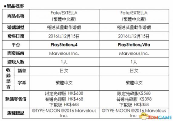 香港‧2016年11月25日 – Sony Interactive Entertainment Hong Kong Limited (SIEH) 今日宣布,PlayStation®4(PS4®)与PlayStation®Vita(PS Vita)专用游戏『Fate/EXTELLA』(Marvelous Inc.)的繁体中文版将于2016年12月15日(四)发售。