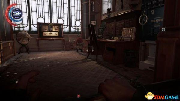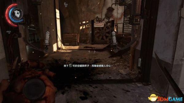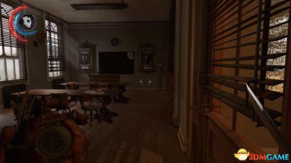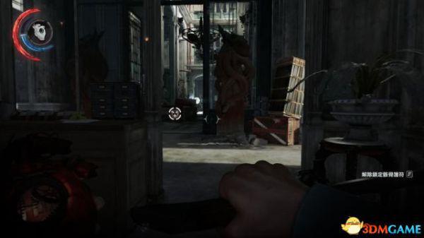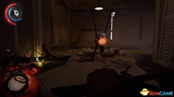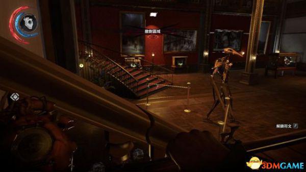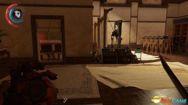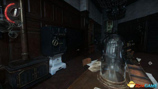 内进至展览厅,拉下拉杆后要立即往左侧的展示柜去躲藏,因为这时候房间机关触碰,周围的墙体、摆设都会改变,而且还会出现一个发条战士。