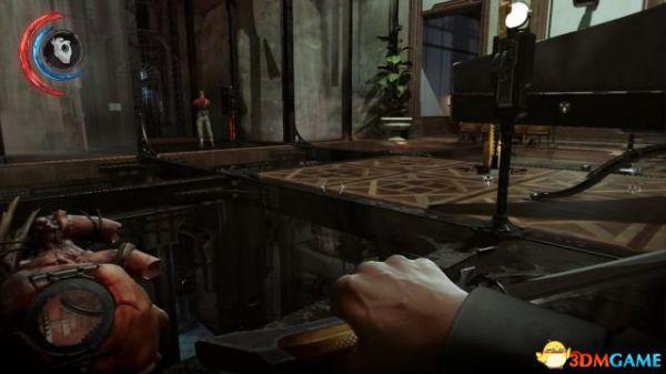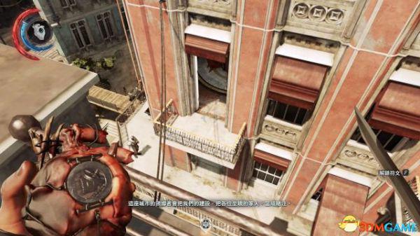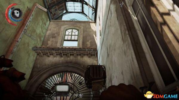大堂办公室内,借助里面的储物柜爬到管道上,继而去到二层窗户的露台,要当心二层见客厅内的巡逻守卫,接着就可以去到窗台右侧的平台。