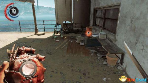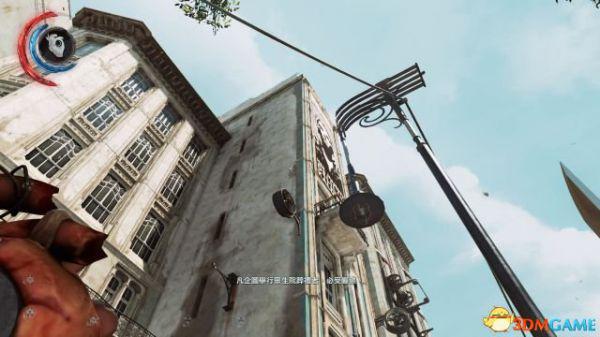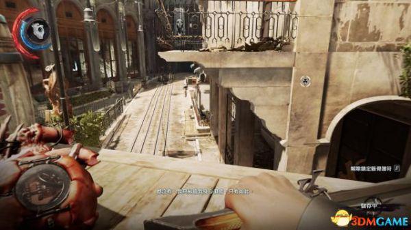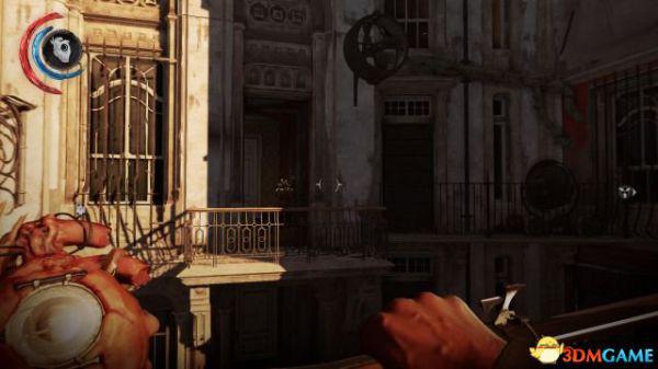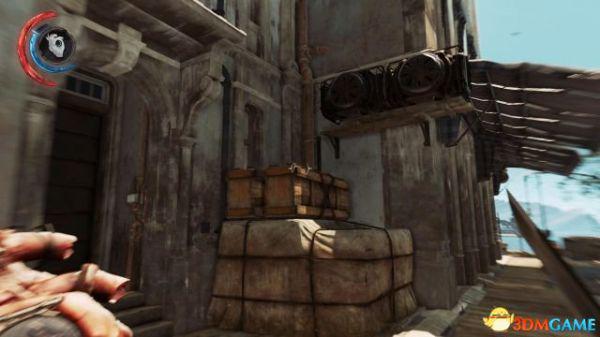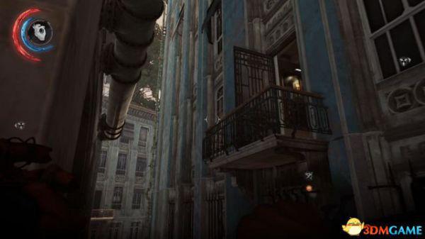然后踩上哨岗右侧的铁箱跳到哨岗顶部继而跳到附近的屋顶上,借助屋顶的管道爬到一处阳台。