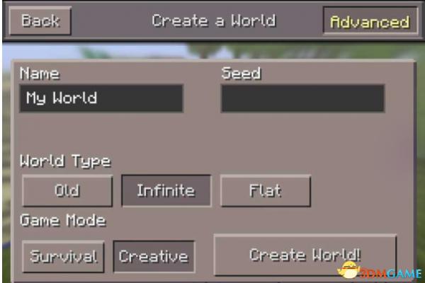 选择“Play→New”之后,点击右上角的“Advanced”会看到“Seed”一栏,只要在其中输入想要进入的地形的Seed编号,选择“Create World!”即可进入。