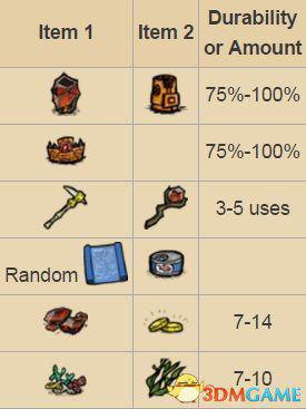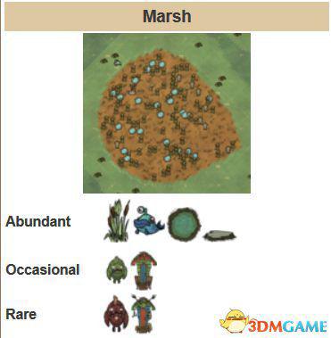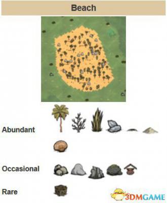 在玩家开始游戏时,沙滩生成于船的碎片附近(near broken pieces of a boat,这是啥意思?)。是前期非常好的地形,有玩家前期所需要的所有种类的资源。其中,丰富的资源有小树枝、草、燧石、椰子树等,并且能找到多种不同的岩石块。还可以从帽贝岩上收集帽贝。沙滩上还能找到沙堆、螃蟹洞、贝壳等。(图中上为大量、中为有几率、下为稀少)。