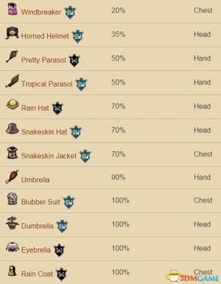 如果玩家一定要进入被淹没的区域,可以用雨伞外加能防水的帽子的组合来防止湿身,能防水的帽子比如魔法帽和猪皮头盔。