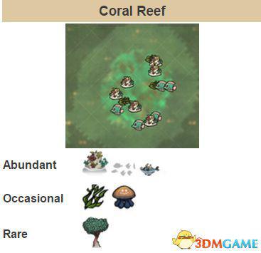 珊瑚礁特点为五彩斑斓的地形,通常有被珊瑚覆盖着的岩石。用矿镐开采的话会掉落2-4个珊瑚。在用矿镐开采之后,还可以用锤子砸掉,掉落石灰石(还有这种事?),但是鉴于石头会沉入海里,所以然并卵,你捡不着它(这是何等的狗血设定)。