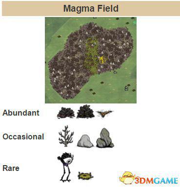 岩浆地形特点为暗色崎岖的地势,有岩浆石堆。岩浆石堆用铲子铲起时,有时会留下喷火口。岩浆地形地面上会找到燧石和石块,岩石量很丰富,但小树枝不太常见。岩浆地形还可能有高鸟。