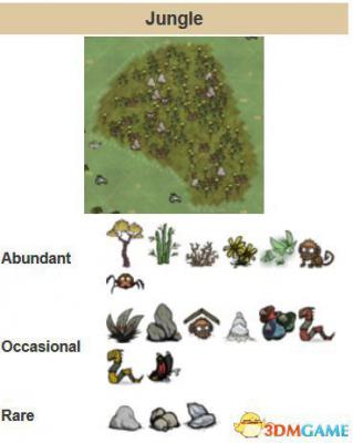 森林的特点是绿中带点红的森里地皮,以及各种热带树、竹子、蛇草、花,并有几率刷金矿岩石。也有可能刷普通的岩石,但几率低。森林中还有蘑菇、浆果等。