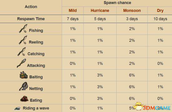 虎鲨可能在任何季节生成,由玩家在海上的某些动作触发。生成之后,对于玩家无仇恨,除非在窝附近,所以经常导致你根本碰不到它。