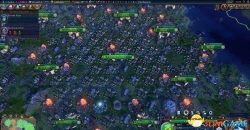 Procoblocked解释了这么做的大体思路,围绕首都中心建造一圈卫星城,利用共享特色区的特性来辅助首都的发展。他一共建造了30个社区,周围有20个体育场,80条贸易路线来维持每回合750的粮食消耗。