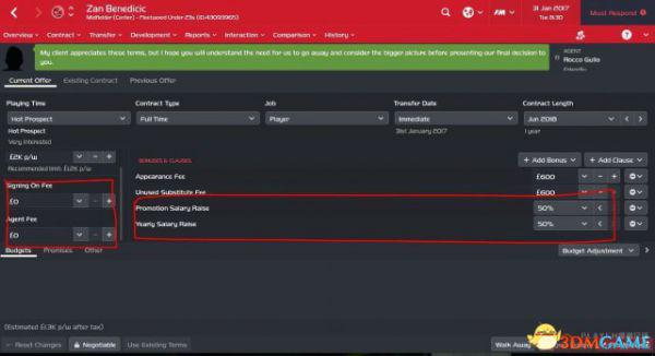另外,为了实现真正一毛钱不花,可以在和球员谈合同时画大饼,加入各种条款、降低工资、签字费和经纪人费用,如下图。