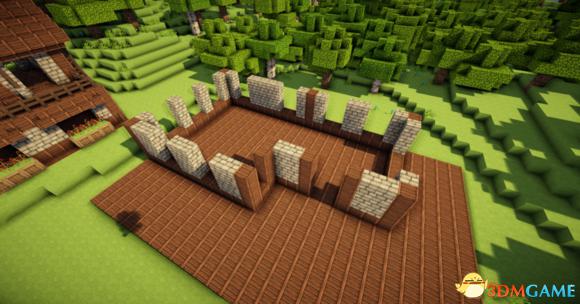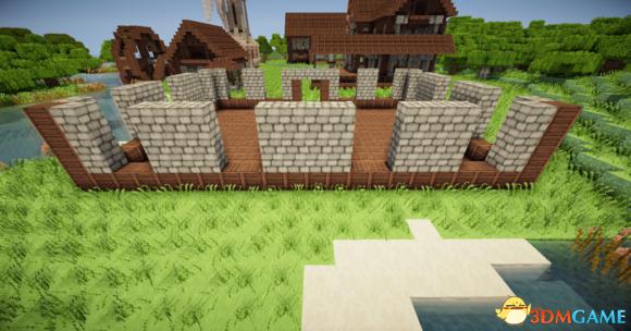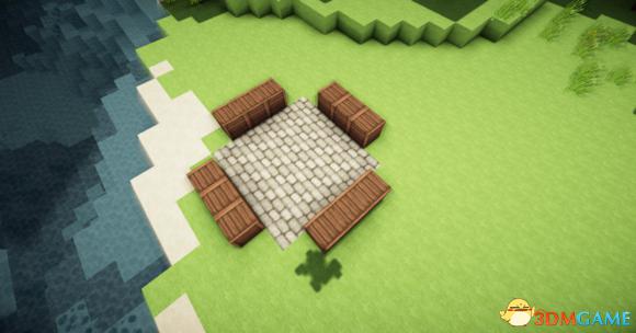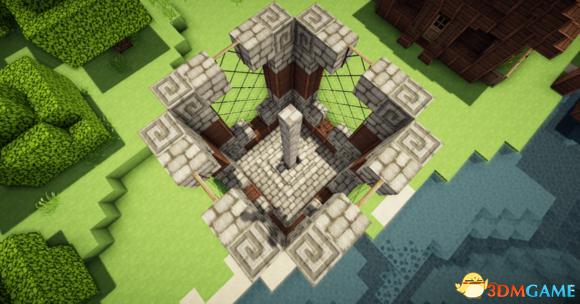 然后围着中心的圆石墙放3个石砖楼梯