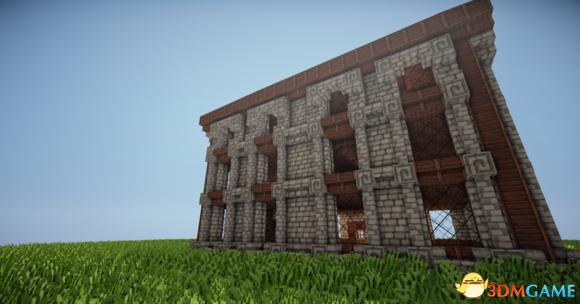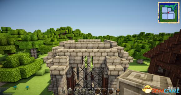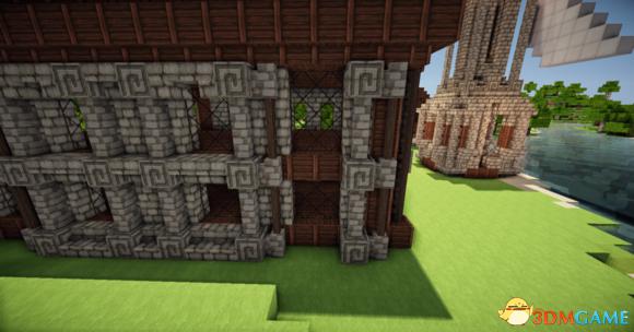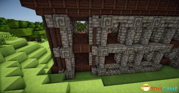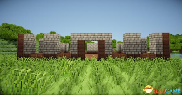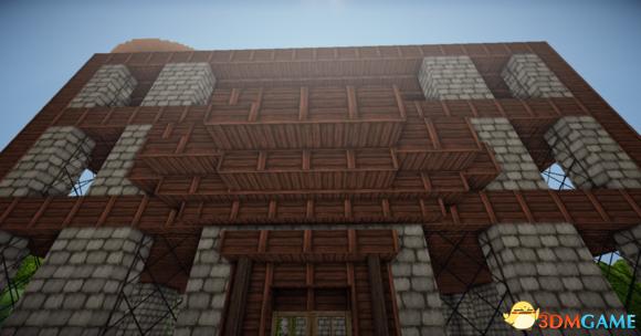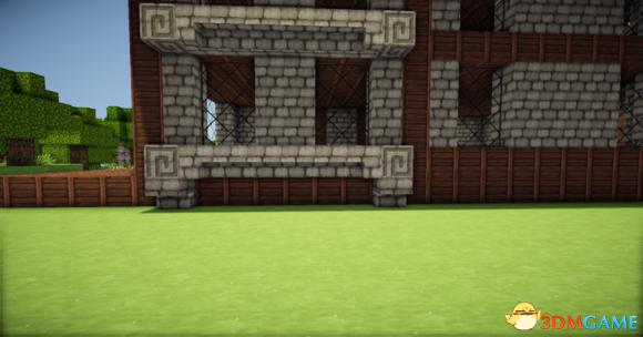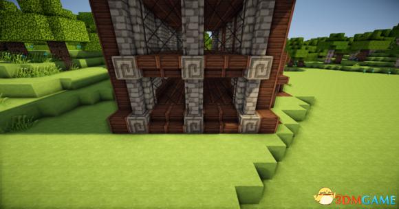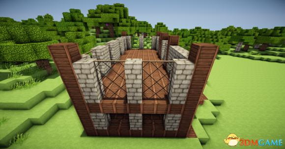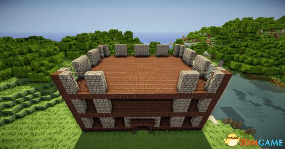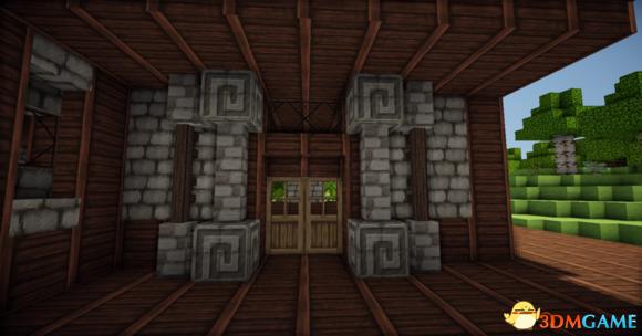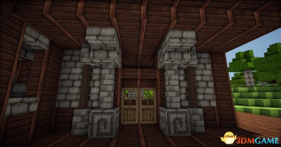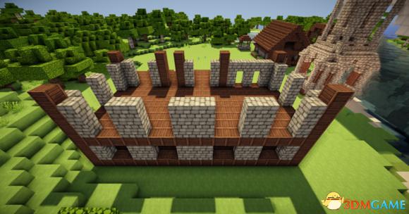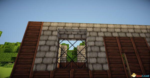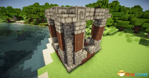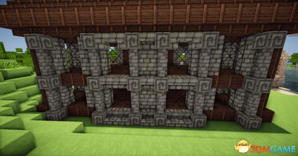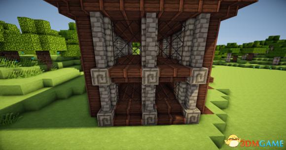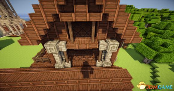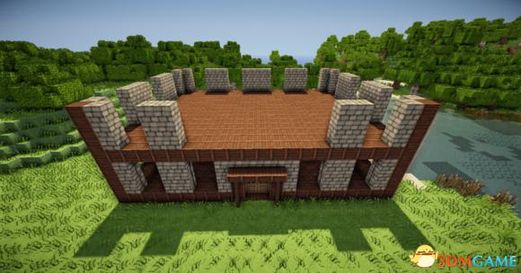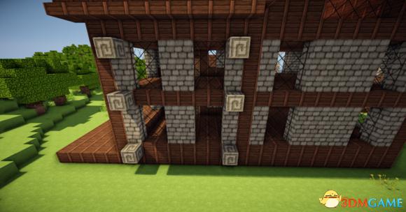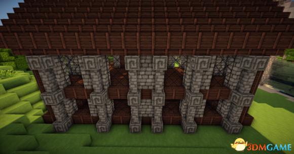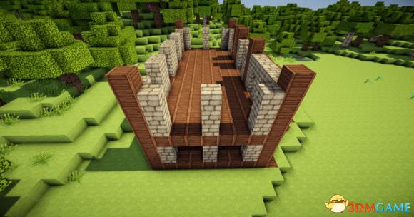 在四个柱子的两边放上石砖,门框上的也连起来(可以替换成圆石,我比较喜欢石砖而已)