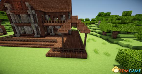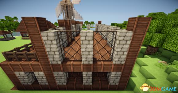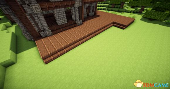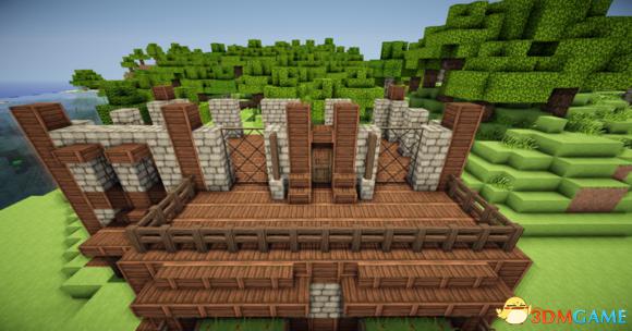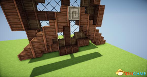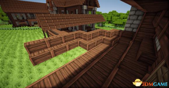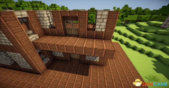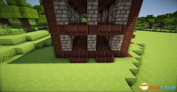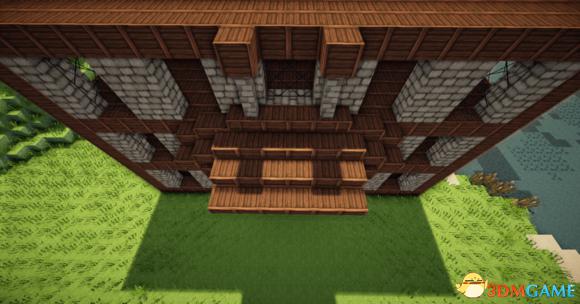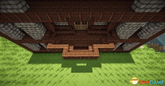 接下来在阁楼的玻璃板下放上三个楼梯 然后分别从左边和右边放上一个楼梯(请务必保证你的视角旋转90度左右) 接下门左右的地上放两个楼梯 装上栅栏