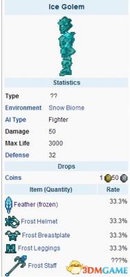 羽毛由冰魔像掉落。肉山后,在暴雪天气的时候,冰魔像会刷新在雪地的表面。不需要晚上,白天也有。平时的下雨天气,跑到雪地就是暴雪天气了。。。。刷新率挺高的,磕了个战争药剂几分钟就遇到4-5只,打完直接冰霜套加3根羽毛了。
