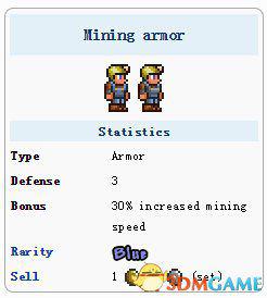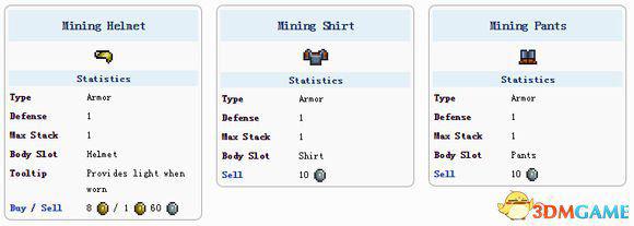 挖矿套装是由采矿头盔,采矿衬衫和采矿裤子组成的。采矿头盔在装备栏时可以提供光亮(时装栏不行)。每件防御为1,总防御为3。