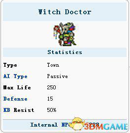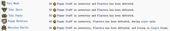 当俾格米法杖在装备栏内且世纪之花被击败后,巫医会卖提基套装,如果在晚上偷偷(?)去找巫医,他会卖你俾格米骨链,如果巫医正好住在丛林里他会卖你力神甲虫……