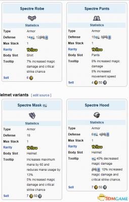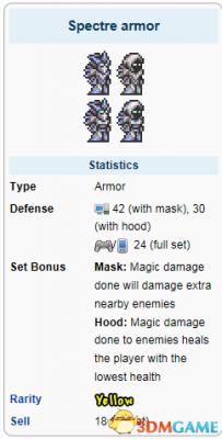 幽魂套装是Terraria 1.2版本中最强的法师套装,当然也要在世纪之花后获得,至于为什么,后面就会知道。这套装甲在PC版本和蓝光,甲虫套装并称为终极三大套……但是在PE版由于甲虫套没出,幽灵套被削弱,所以只有蓝光套仍然站住了……