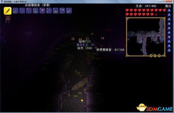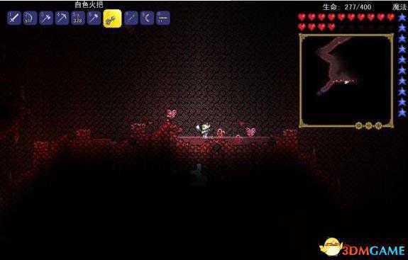 深入血腥之地(一个世界中血腥之地和腐化之地只能有一个)人品真不错,身边有两个生命水晶,可惜血已经上限了。生命水晶旁边的一坨眼球是恶魔祭坛啊,再问砍手。血腥之地是个很可怕的地方。有红色植被覆盖,上有阴影木(黑灰色,造木剑攻击力为10)花纹还挺漂亮的,前期特殊生物有血肉之虫,巨脸怪,鲜血蜘蛛。血肉之虫有大中小三种,大的血有120,中等血有60,小的只有45。会飞,咬你一口伤害15左右。