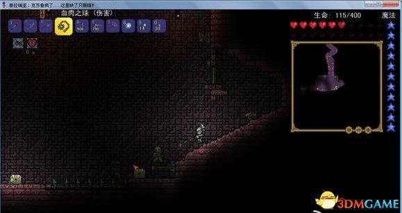 上图重口比大的东西就是克鲁苏之脑,也就是克总。克总刚开始会叫一群小弟来啃你,结果克总带他们太不好了,打一下就跑。克总也很厉害,会瞬移(小黑你妈妈有故事!)发狂后就像上图,蹦出个眼睛,穿墙,撞你一下扣20,认为打克总这种东西就用不着搭战场了,技术够硬几下搞定。