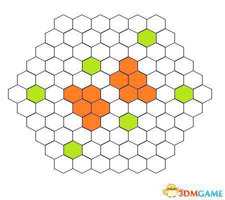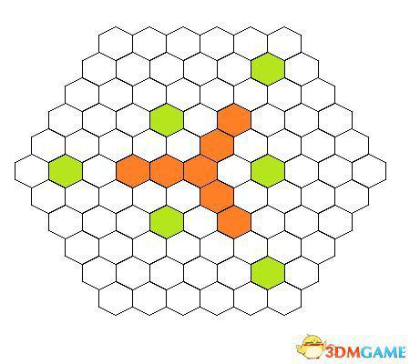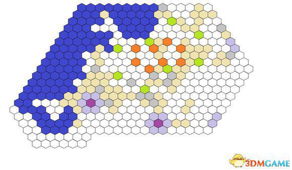图例:绿色是城市选址,橙色是工业区位置,蓝色海洋,紫色城邦,灰色山脉,土黄色是能够建矿场和采石场的地块。