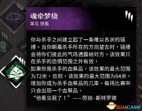 很多人觉得魂牵梦绕是来搞笑的,实际上如果存在无敌房,这个技能可以让屠夫痛不欲生,因为他很难卡你视野阴人,你还可以无限爆点,是不是很心动,顺带一提新鬼的心跳范围小,在无敌房如果用上这个技能他永远也阴不了你,最典型的就是精神病院。