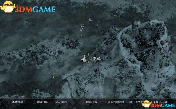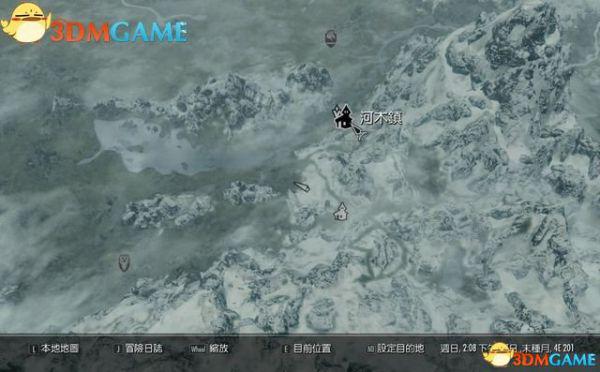 按M键打开世界地图,河木镇在当前位置的东北方,需要沿着山脚绕过去。