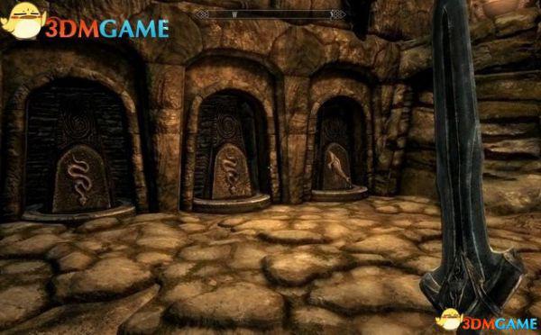 来到如图的房间解决一个简单的谜题,注意铁栅门的上方本来有三块石板,中间的一块掉了下来,这样就知道三块石板的顺序是:蛇-蛇-鱼。