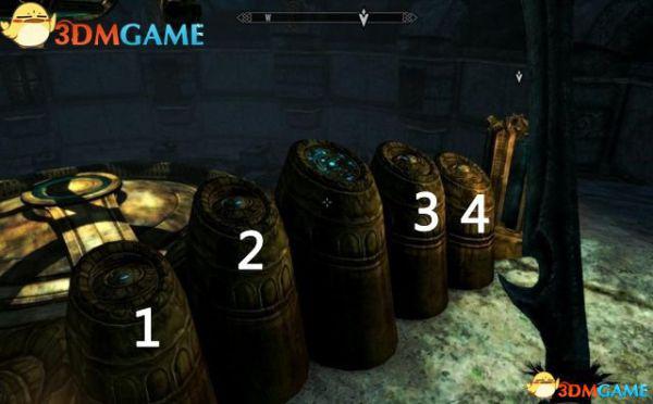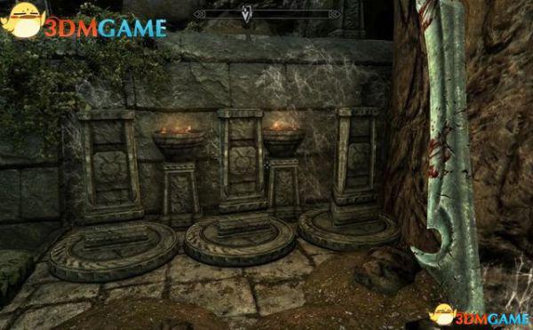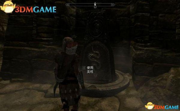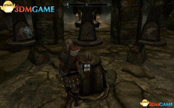来到如图位置,将前方的三个支柱上的图案分别转成鹰-蛇-鹰,再扳动基座上的拉杆,会听到机括声响,打开一道栅门。