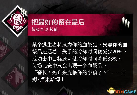 还算不错的一个技能。最好配合不不屈不挠完成双擦刀流派那就很厉害了。总的来说单个的话用处不显著,配合不屈不挠就是非常吊的套路。因为麦克尔的特性让他一刀一个人,这个技能略微有点和他不相符合,但配合夹子屠夫和隐身屠夫应该会很厉害。可以点出传承后给夹子他们。