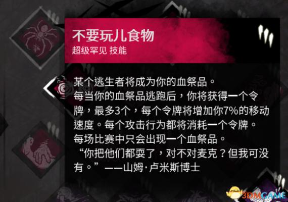 一开始觉得超级吊的一个技能。但经过了理智的分析,其实一般般。玩这个你就必须让一个人逃掉增加你的速度,首先这样玩起来不爽。然后你这个还是有次数限制并且并非永久的。最多3次。并且你空刀照样消耗,看起来非常厉害增加移速但你直着追救行干什么非要让人跑掉。就算有用处用途也很狭义。不推荐的一个技能。