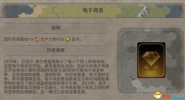 市场经济:经济政策,由资本主义解锁。目的地已开发的奢侈资源和战略资源为国际贸易路线增加1点金币、2点文化值和2点科技值。