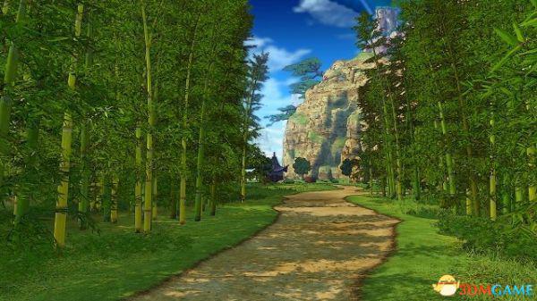 绿意盎然的竹林区域。在这条两旁被树荫覆盖的道路上,可能会捡取到道具。