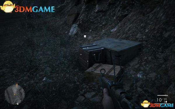 离开石丘,我们朝着列车营地方向潜行,在不远的地方有一座小石堆,在石头根部找到另一只小木箱,拾取野战手册(2/5)。