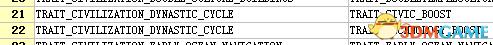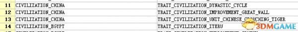 首先是在Civilizations.xml里找到中国的CivilizationType和对应的TraitType,这两个条目是在CivilizationTraits目录下面的