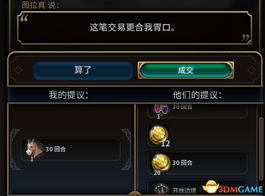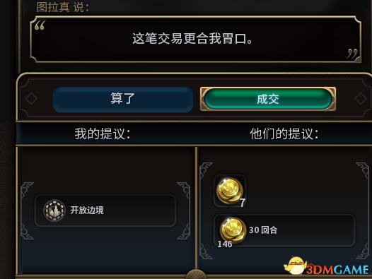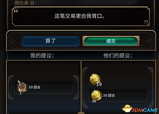 然后你会发现你依然可以将已经交易出去的回合金放上去.此时把你所有的钱和一个可以交易的资源放上去,问对方给什么