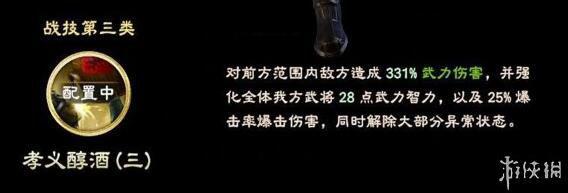 关平武将技——孝义醇酒:对前方范围内敌方造成331%武力伤害,并强化全体我方武将28点武力智力,以及25%爆击率爆击伤害,同时解除大部分异常状态。