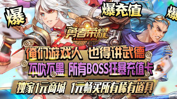 《勇者荣耀》是一款高操作性MMORPG动作手游,BOSS玩法全新调整,独家1元商城,1元即购稀有道具;所有boss全掉充值卡,十元,百元,千元,最高爆万元充值卡,掉落全拼运气,商城出售各种稀有材料,装备,钻石买一切;同时登录,签到保底送千元充值卡;原创独特画风,创新战斗画面,职业自由转换,全程体验连招快感;
