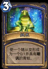 这张卡我觉得可以被称为版本最强单解,致射的不稳定,羊的四费,刺杀5费。而且还会触发亡语效果,但是一张呱进可踹脸呱怪,退可打完变墙。在之前卡拉赞刚出来的时候复活牧一直承载着牧师们的希望准备扬帆起航,但是中速萨的崛起两张呱又把牧师打到了谷底。我已经见过无数个复活的小青蛙宣告萨满T1的位置不可撼动,也看到很多狮子,女王,火爹,丁丁成为了一个个可爱的小青蛙。