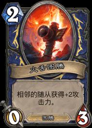 火舌基本在萨满任何一个版本最主流的萨满都是满编的。图腾的属性,左右+2攻的buff加上自身是一个3血量的图腾,是一张非常优秀的职业卡。也很契合萨满大量铺场的机制,火舌也是在今年退环境分标准狂野之前萨满这个职业和图腾契合度比较高的牌之一。可以完美的利用场上没有攻击的图腾进行场面的互换拉开卡差,而且现在炉石有一个很现实的问题就是很多怪虽然没有嘲讽两个字,但对于很多职业哪怕是无脑打脸的猎人 脸战来说都是自带嘲讽的。火舌这张卡在之前脸萨的思路里起手银色侍从后手是可留的,个人觉得中速萨可以套用脸萨的开局和前期思路。先手不建议留,毕竟火舌的定位是优势斩杀,均势翻场,劣势没啥卵用的定位。