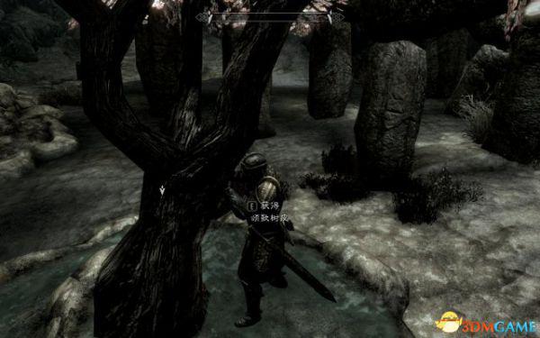 山洞里有一把古怪的匕首,上前按e键拿取匕首,然后用匕首到附近的一棵大树上刮树皮。