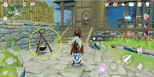 3、靠近与她对话,花费5000摩拉购买菜谱,买完食谱之后,用安柏点火,即可在门口烹饪菜肴;