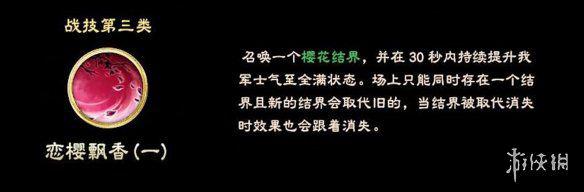 恋樱飘香:召唤一个樱花结界,并在30秒内持续提升我军士气至全满状态。场上只能同时存在一个结界且新的结界会取代旧的,当结界被取代消失时效果也会跟着消失。