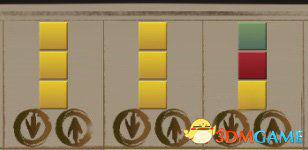 和初始状态相比可以看出,先点上排左边的下,让黄的下来,然后点左边上排的右,这样的目的是为了让三个黄的连在一起,然后点三下上排左边的上三下,可以发现我的左上角是不是有三个黄的一起了,如果这一步没看懂,继续往下看,每一列原理都是一样的,都是弄好一列然后推上去,然后下一列。