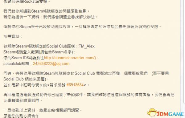 亲爱的Rockstar客服,请帮我解除socialclub与steam帐号的绑定。我的steam号是XXX,我的steam邮箱是XXXXX@qq.com。