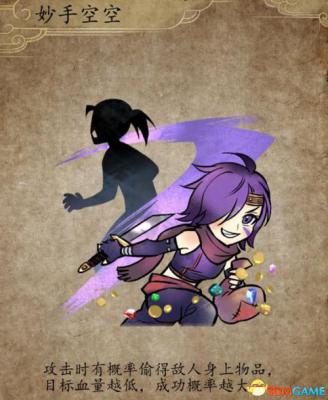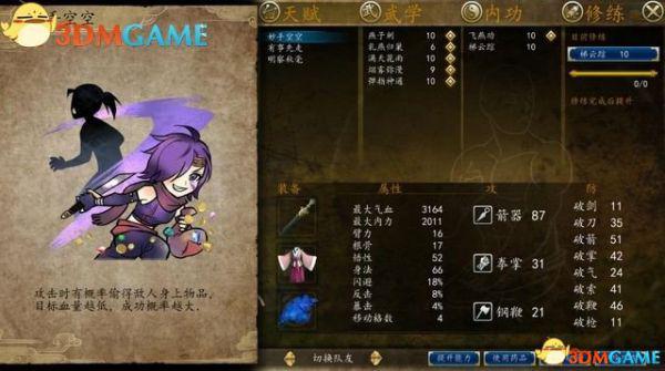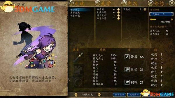当你的队伍中拥有像史燕这样具有“妙手空空”天赋的队员时,可在敌人弱血的时机偷取物品,某些对手的身上可偷得武功秘藉。比如从赛王世子身上可偷取《化功大法残本》、从少林三老身上可偷取《罗汉伏魔功》、在铁叉部的战斗中可偷取《吸星大法》。